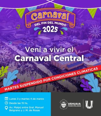Atento a los pronósticos consultados y en diálogo con las áreas técnicas involucradas, la organización del Carnaval del Fin del Mundo informa a la comunidad que se suspende la segunda jornada de los festejos centrales previstas para el día de hoy.