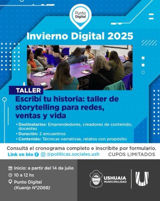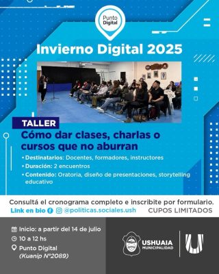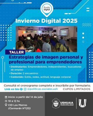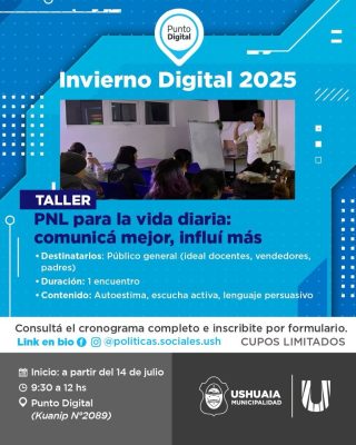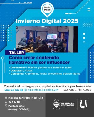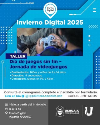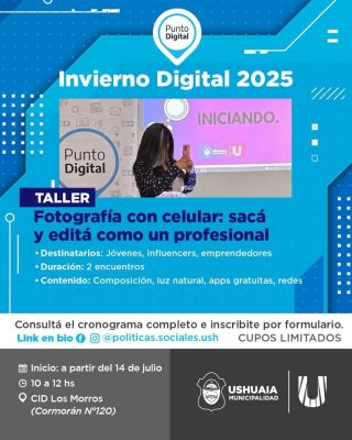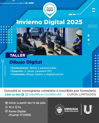 La Secretaría de Políticas Sociales, Sanitarias y Derechos Humanos de la Municipalidad de Ushuaia, a través del Punto Digital y en conjunto con el Centro de Inclusión Digital Los Morros (CID), invita a la comunidad a sumarse a la lista de espera para participar en las actividades del ciclo Invierno Digital 2025.