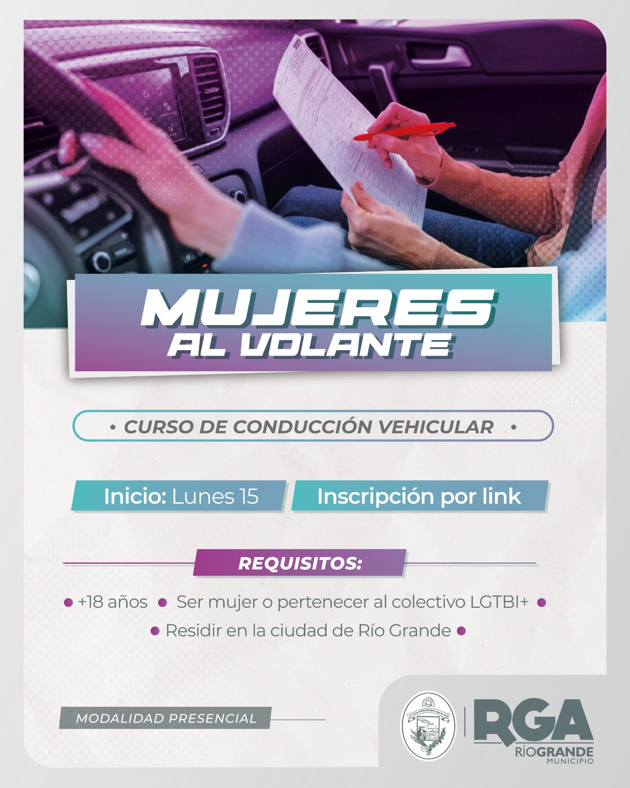 El Municipio de Río Grande, a través de la Secretaría de Género y Desarrollo Comunitario en articulación con la Secretaría de Gestión Ciudadana, abre las inscripciones para formar parte de una capacitación de manejo destinada a mujeres y personas del colectivo LGBTI+ mayores de 18 años que residan en la ciudad, que no sepan conducir o bien, no cuenten con su licencia de conducir.